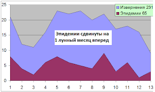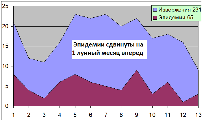 А на самом деле, корреляция есть, причем, довольно хорошая, но со сдвигом в один лунный месяц. Сначала пик переживают свидетельства об извержениях, а спустя один лунный месяц такой же пик переживают свидетельства об эпидемиях.