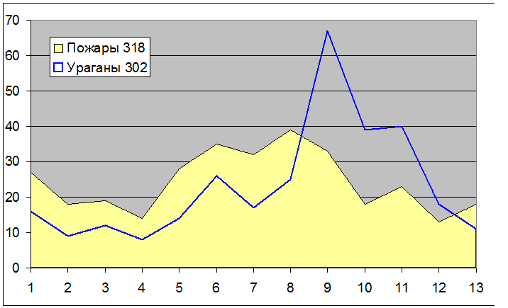 Получил я его довольно просто: например, смотрел, выпадает ли на год пожара ураган или нет. А годом раньше выпадает? А годом позже? Оказалось, что КАЖДЫЙ катаклизм имеет статистически значимое число "парных" катаклизмов из соседних групп, и большая их часть стремится состояться в тот же год (нижние части "крыльев" этой "бабочки" показывают, как сильно уменьшается феномен парности, если отойти на год вперед или год назад).