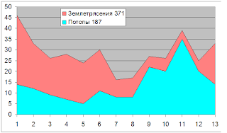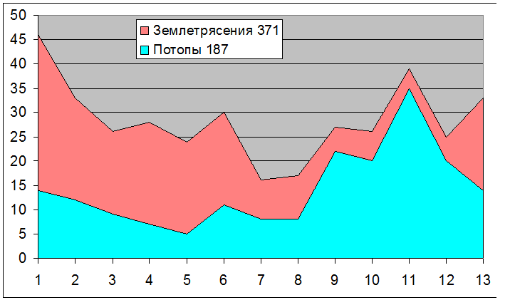 На то, что катастроф не было чересчур много, и мы видим разбросанные историками по столетиям обрывки небольшого количества реальных апокалипсисов, указывает и корреляция катастроф по дням года. Поскольку с массивами работать удобнее, я разбил все датированные до дня катастрофы по 13 лунным месяцам года, и вот результат: частоты катаклизмов разного род недвусмысленно коррелируют. Вот землетрясения и наводнения.