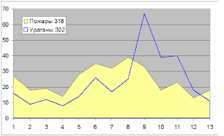 А вот корреляция пожаров и ураганов: выпирающий участок это сезонные ураганы Карибского бассейна; они всегда будут выпирать.