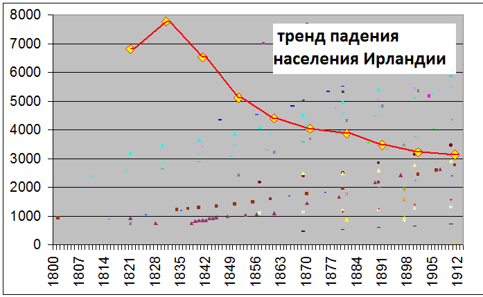 А вот в Ирландии – напротив – число населения падает: люди выезжают в Новый Свет, начиная где-то с 1830 года. Видимо, до этого года в Ирландии об Америке еще не знали (это не шутка).