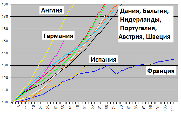 А теперь – казусы. Это динамика роста населения стран Европы в XIX веке. Быстрее всех множатся немцы да англичане, а вот Испания да Франция мощно отстают.