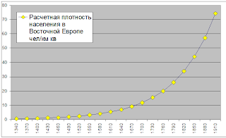 И вот если оттолкнуться от 1910 года и двинуться в прошлое, то выйдет нормальная экспонента. И следует из этой экспоненты, что около 1600 года плотность населения Восточной Европы составляла менее 5 человек на 1 кв. км – как у нас в Забайкалье.