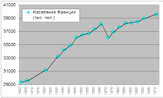 И во Франции то же самое около 1871 года: как раз в это время у Франции отняли Эльзас и Лотарингию (1,5 млн. чел), ну, и военные потери сказались (590 тысяч).