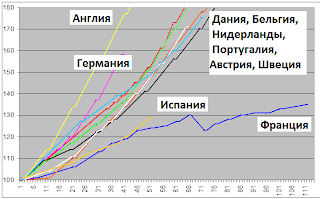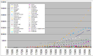 И дело ведь не в военных потерях. Падение 1871 года у Франции замечательно видно, однако тренд задает не оно. Как Испания, так и Франция стремительно недобирают населения, и, возможно, как раз в это время (а вовсе на в XVI-XVII веках) эти страны интенсивно осваивают колонии. Или, как вариант, французские историки, спасая легенду о Великой Французской революции, заврались.