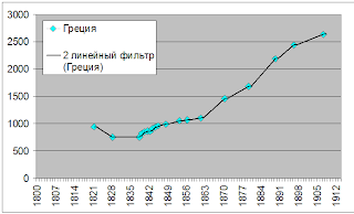 И в Греции видно падение: как раз в это время страна отделяется от Османской империи, земли переходят из рук в руки, и статистика народонаселения меняется.