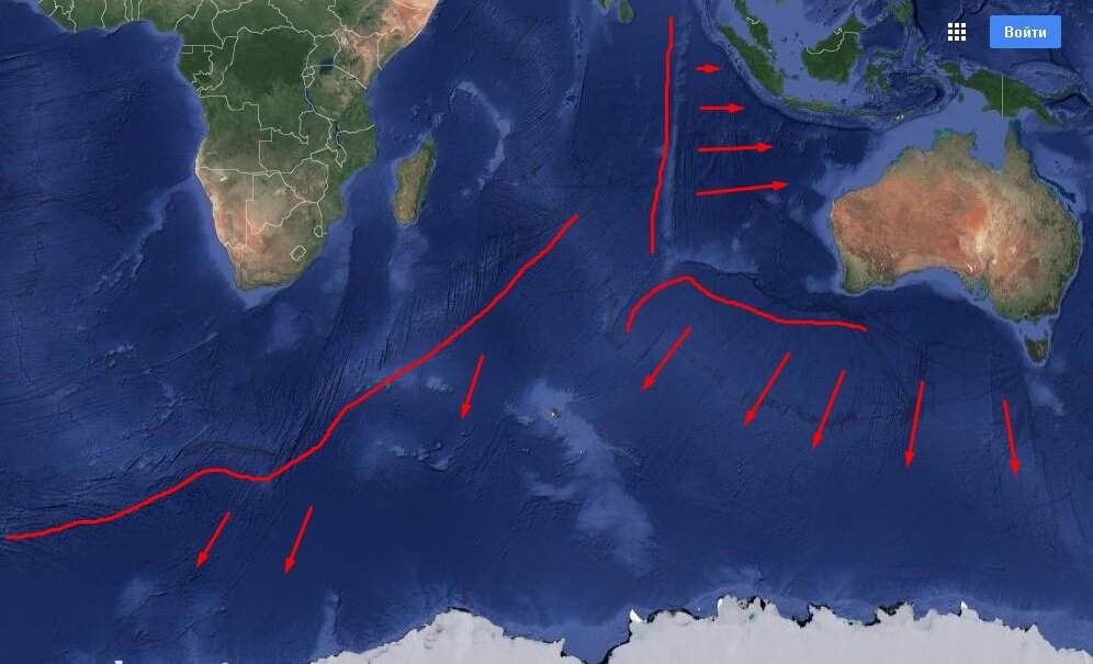 Так же очень сильно увеличилась площадь океана в южном полушарии в районе Антарктиды. Австралия осталась на месте, а Антарктида переехали на южный полюс.