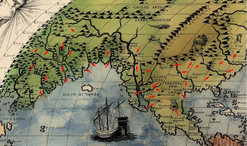 Я по-выделял на карте города. Как на территории Сев. Америки, так и на стороне Азии. Официально, в это время никаких городов в Северной Америке не было. Лишь на территории современной Мексики и южнее – города майя, инков и др. индейцев. Но, как видно, в глубине материка тоже есть множество городов. Вот часть их названий (что смог прочитать): Модана, Лакрус, Каллаотор, Кока, Сипола, Тамака, Тигуар, Акса.