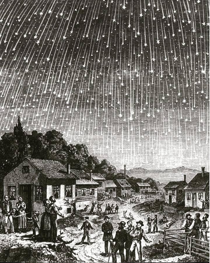12 ноября 1833 года метеоритный дождь был настолько сильным, что все небо было покрыто метеорами. Многие тогда подумали, что пришел конец света. https://dzen.ru/a/YgwRA3K6XTF4I9sD