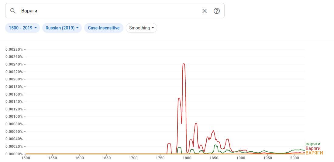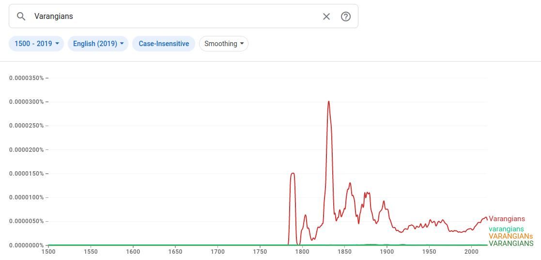 А вот варяги на другой стороне света "зашли", здесь норманская теория стала национальной историей. Но как понятие впервые появляться варяги начали когда нанятые ингерманландской династией германские историки (Байер–Миллер–Шлёцер) это понятие, вероятно, и разработали: